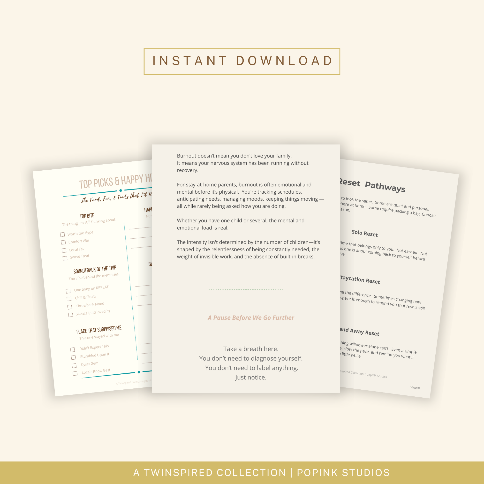 A practical reset system featuring micro resets, structured pathways, travel-inspired ideas, and grounded prompts designed for real-life parenting.